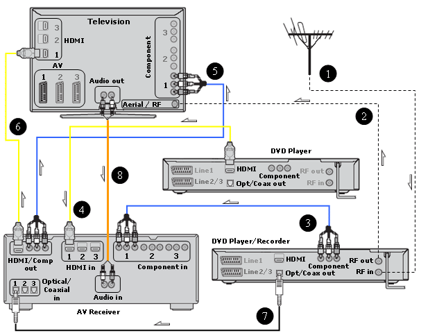 Television, AV Receiver, DVD Recorder (Comp), DVD player/Blu-ray Disc player (HDMI)