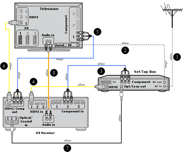 The below diagram shows the most common connections for your configuration. For each connection type, a colour is used to make the diagram easier to understand. More information on connection types can be found here. Choose your preferred type of connection or quality level from the diagram below, but remember that when using component connection (indicated by the blue colour) you also need to connect an RCA Stereo Cable, or a Digital Coaxial cable, or an Optical cable to your television set or AV receiver to output sound, as component cable does not transmit sound.