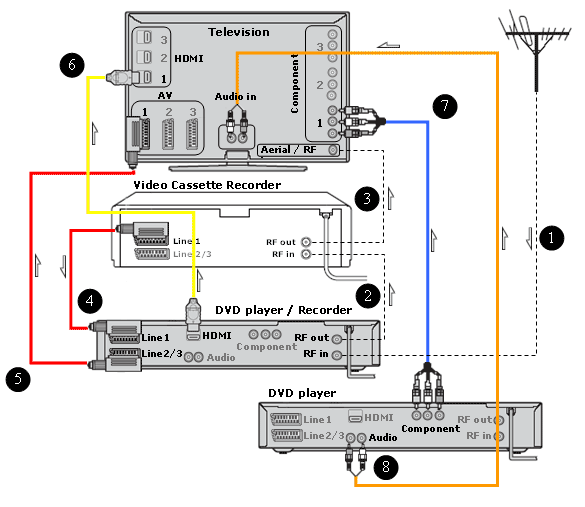 Television, Video Cassette Recorder, DVD player/Recorder (HDMI), DVD player/Blu-ray Disc player (Component)